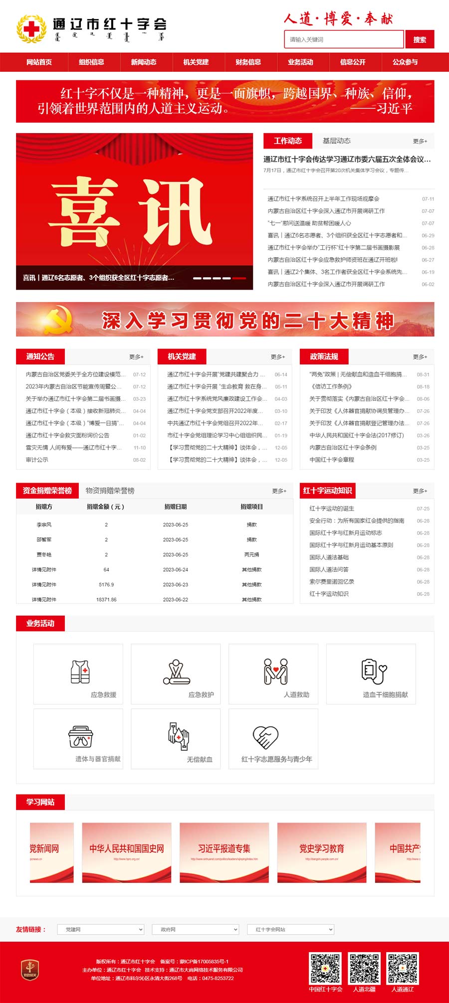 近年來,通遼市紅十字會在市委、市政府堅強(qiáng)領(lǐng)導(dǎo)和自治區(qū)紅十字會的正確指導(dǎo)下,各項工作取得了長足發(fā)展。全市紅十字會系統(tǒng)年度籌資穩(wěn)定在1000萬元以上,8個旗縣市區(qū)全部突破100萬元,市本級多年穩(wěn)定在200萬元以上;自治區(qū)紅十字會“十四五”規(guī)劃重點(diǎn)項目建設(shè)高質(zhì)量推進(jìn),實(shí)施總會和自治區(qū)“博愛家園”項目,推進(jìn)建設(shè)紅十字示范校、應(yīng)急救護(hù)角、應(yīng)急救護(hù)點(diǎn)、人道文化傳播點(diǎn)、人道文化傳播基地、志愿者服務(wù)基地等重點(diǎn)項目;持續(xù)開展“博愛送萬家”“大病救助”“資助貧困學(xué)生”“光明行”等社會救助和公益活動,市紅十字會的社會影響力和公信力逐步提升,聯(lián)系服務(wù)群眾的橋梁紐帶作用和人道領(lǐng)域助手作用顯著增強(qiáng)。